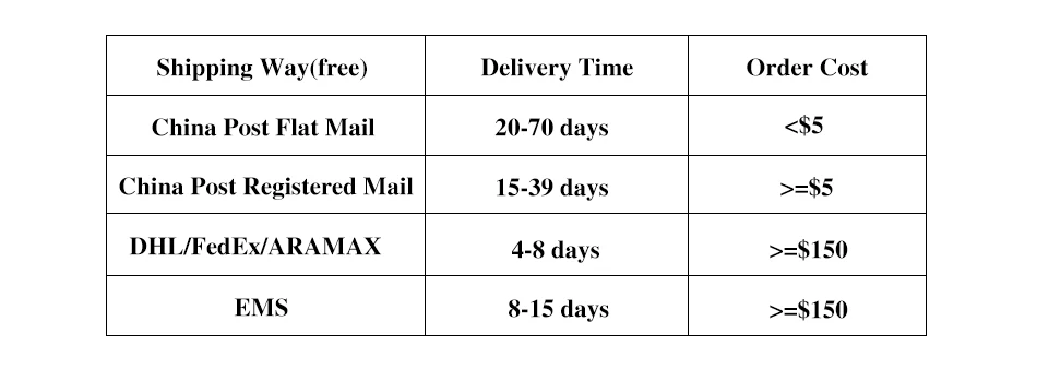 We ship all of our items worldwide within 48 hours by EMS/DHL or China Post Air Mail /China Post, the shipping way will depend on the total cost